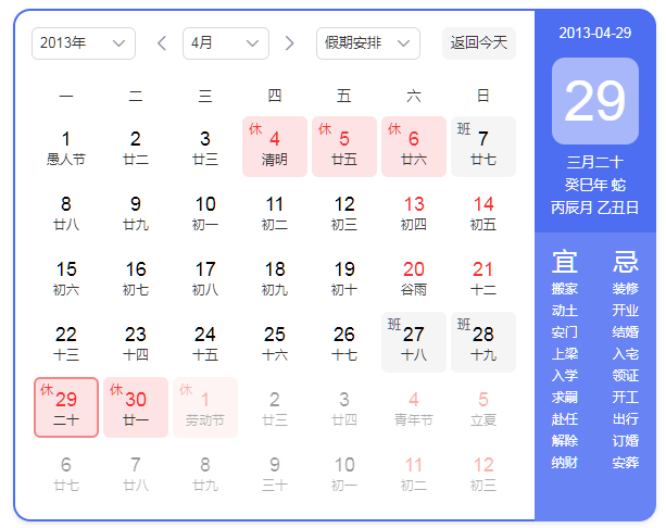 4月29日至5月1日放假調(diào)休,共3天。4月27日(星期六)、4月28日(星期日)上班。