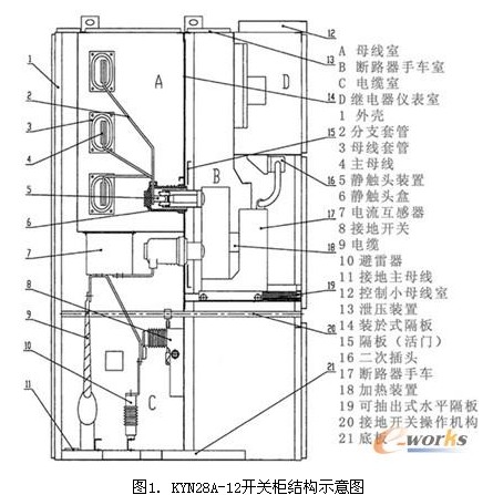 交流金屬封閉開關(guān)設(shè)備》設(shè)計(jì)。整體由柜體和中置式可抽出部件(即手車)兩大部分組成,開關(guān)柜的結(jié)構(gòu)示意圖見圖 1